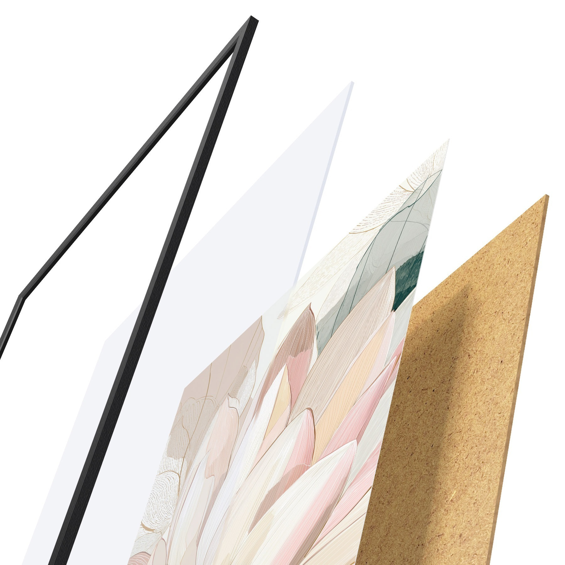 El póster consta de marco, plexiglás, imagen impresa y soporte de aglomerado. El póster puede colgarse inmediatamente en la pared gracias a los soportes de la parte posterior.