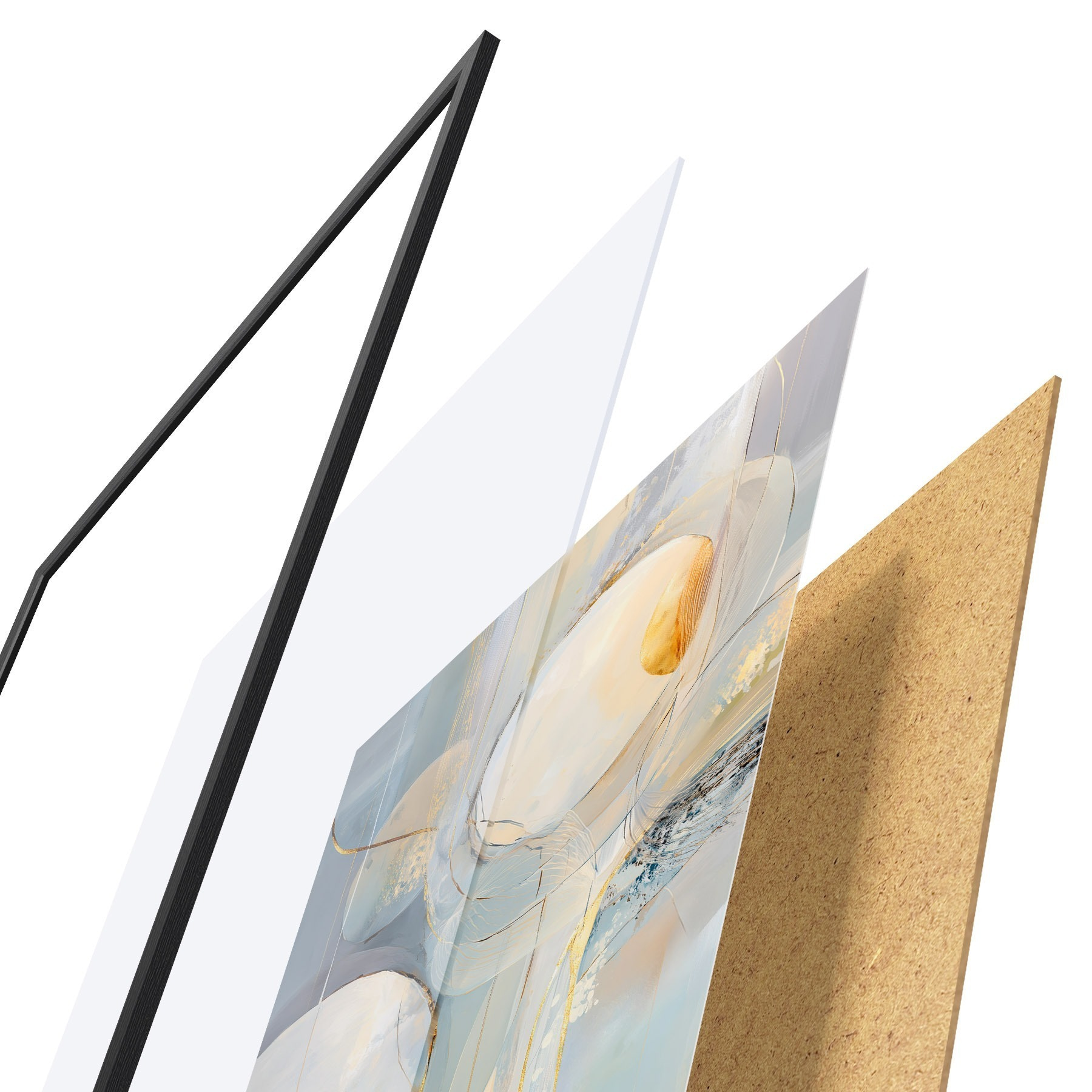El póster consta de marco, plexiglás, imagen impresa y soporte de aglomerado. El póster puede colgarse inmediatamente en la pared gracias a los soportes de la parte posterior.