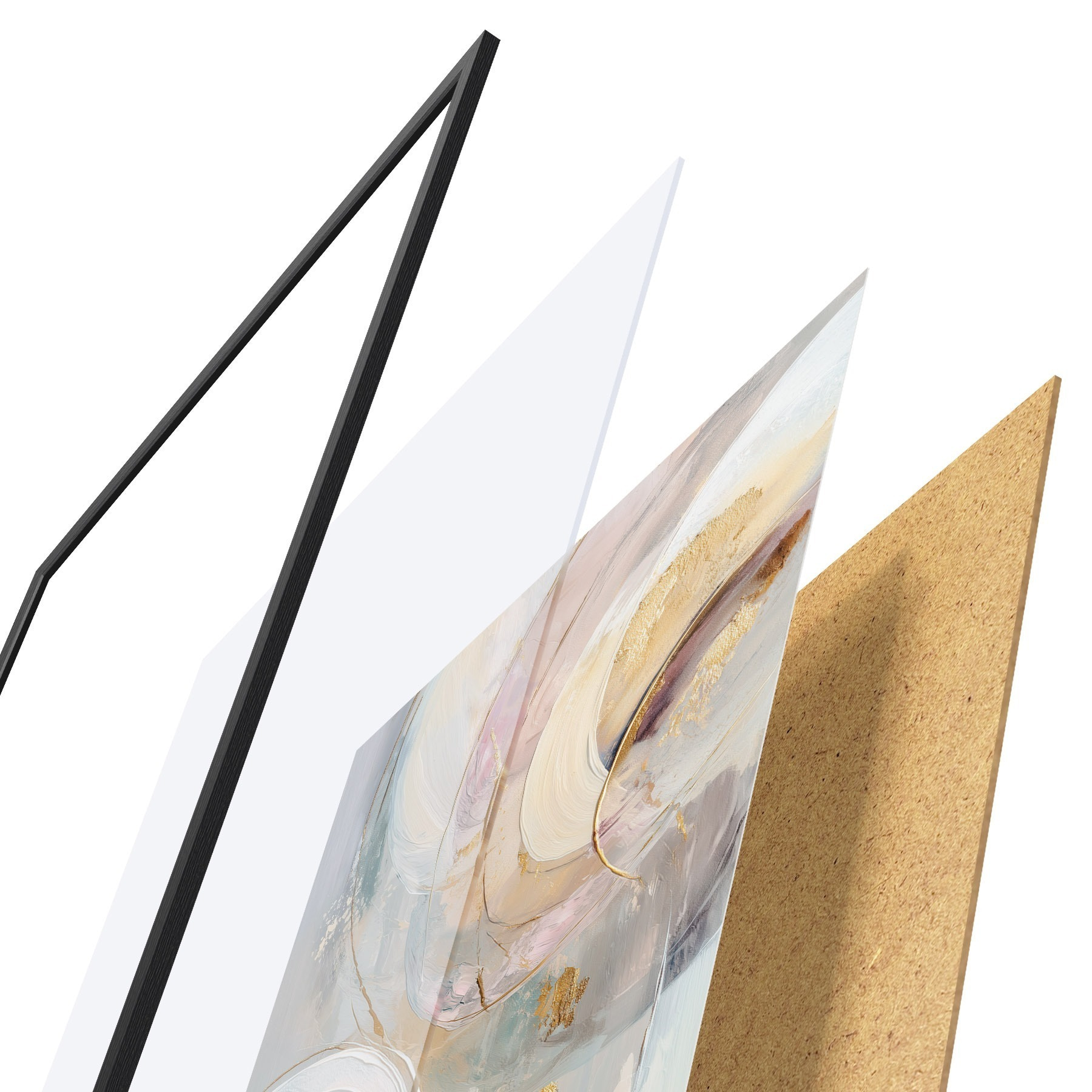 El póster consta de marco, plexiglás, imagen impresa y soporte de aglomerado. El póster puede colgarse inmediatamente en la pared gracias a los soportes de la parte posterior.