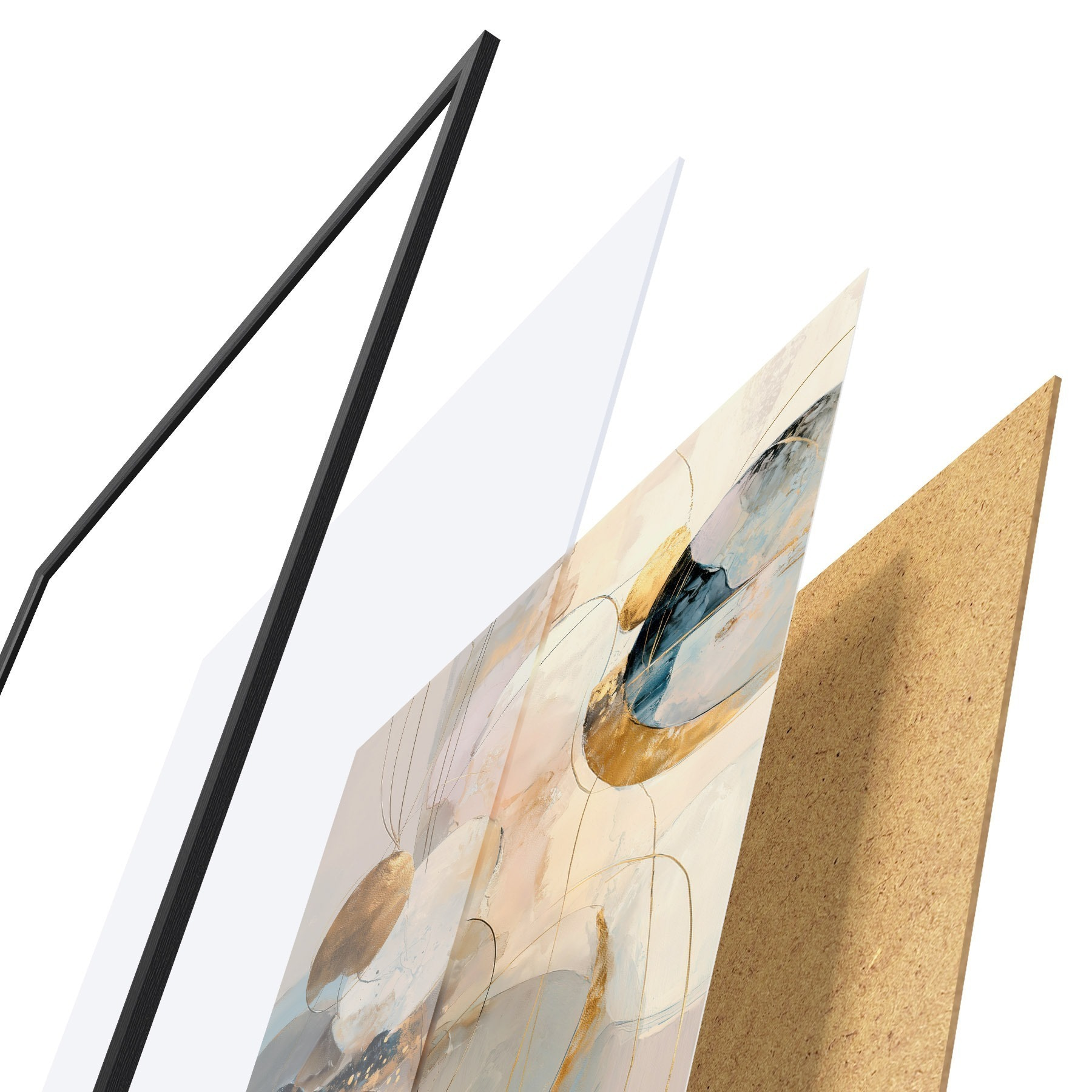 El póster consta de marco, plexiglás, imagen impresa y soporte de aglomerado. El póster puede colgarse inmediatamente en la pared gracias a los soportes de la parte posterior.