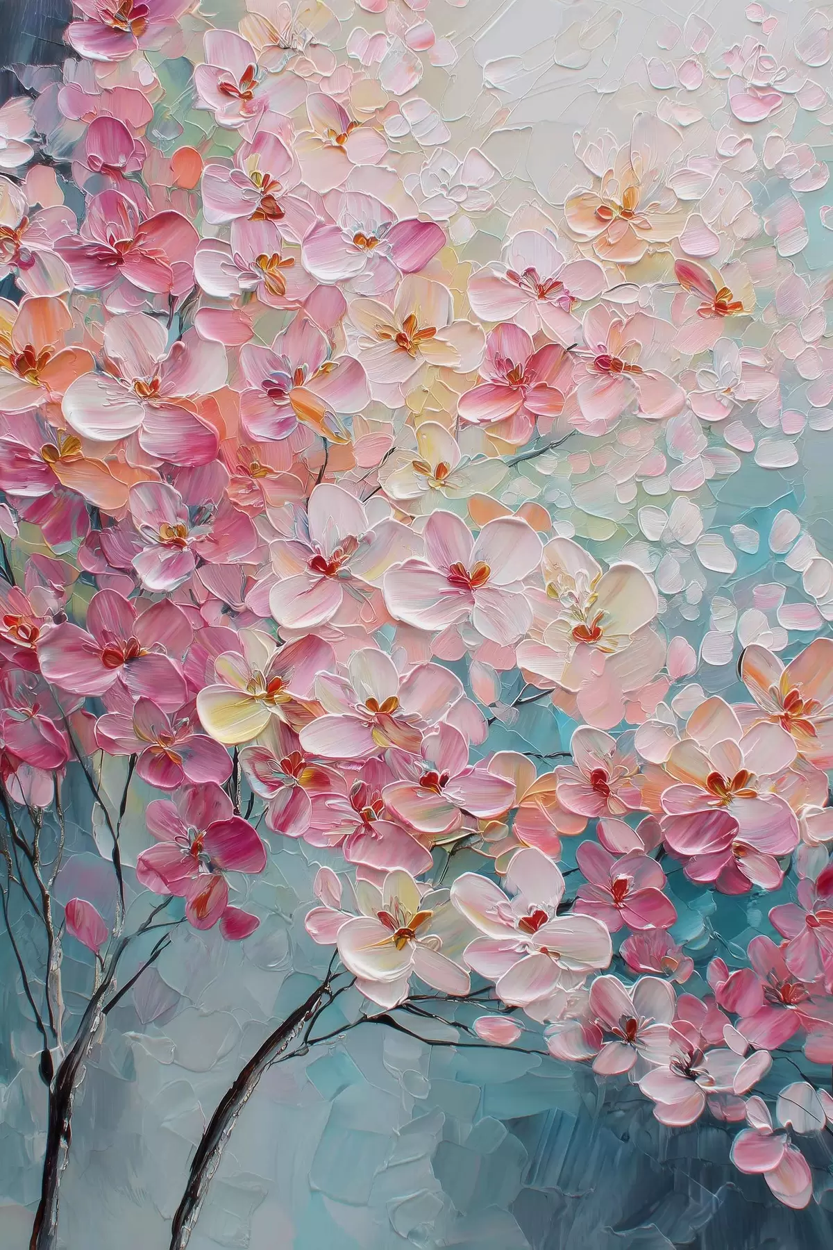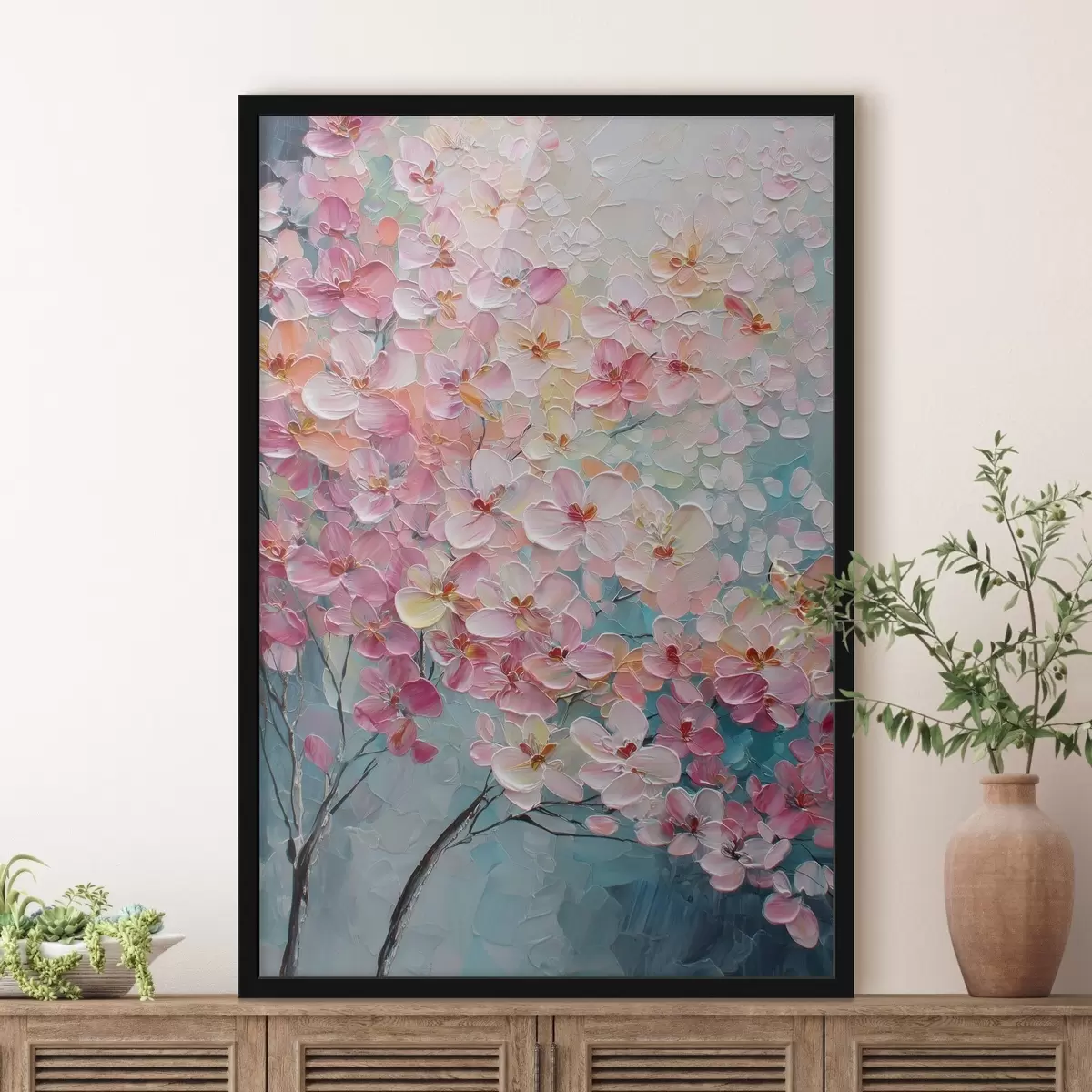 Poster Rama con flores rosas sobre fondo azul en estilo pintura al óleo. Nr f47987