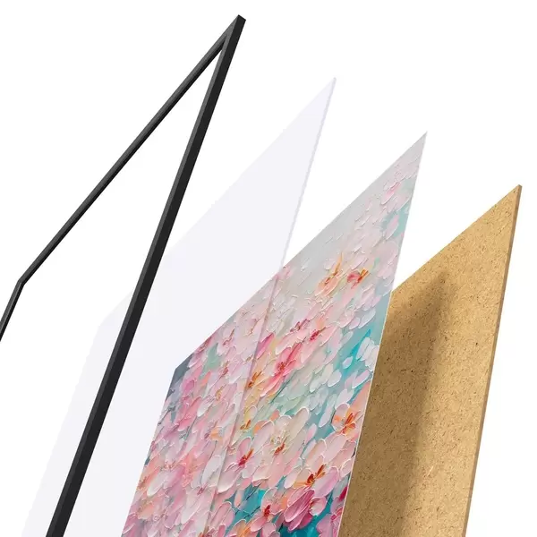 El póster consta de marco, plexiglás, imagen impresa y soporte de aglomerado. El póster puede colgarse inmediatamente en la pared gracias a los soportes de la parte posterior.