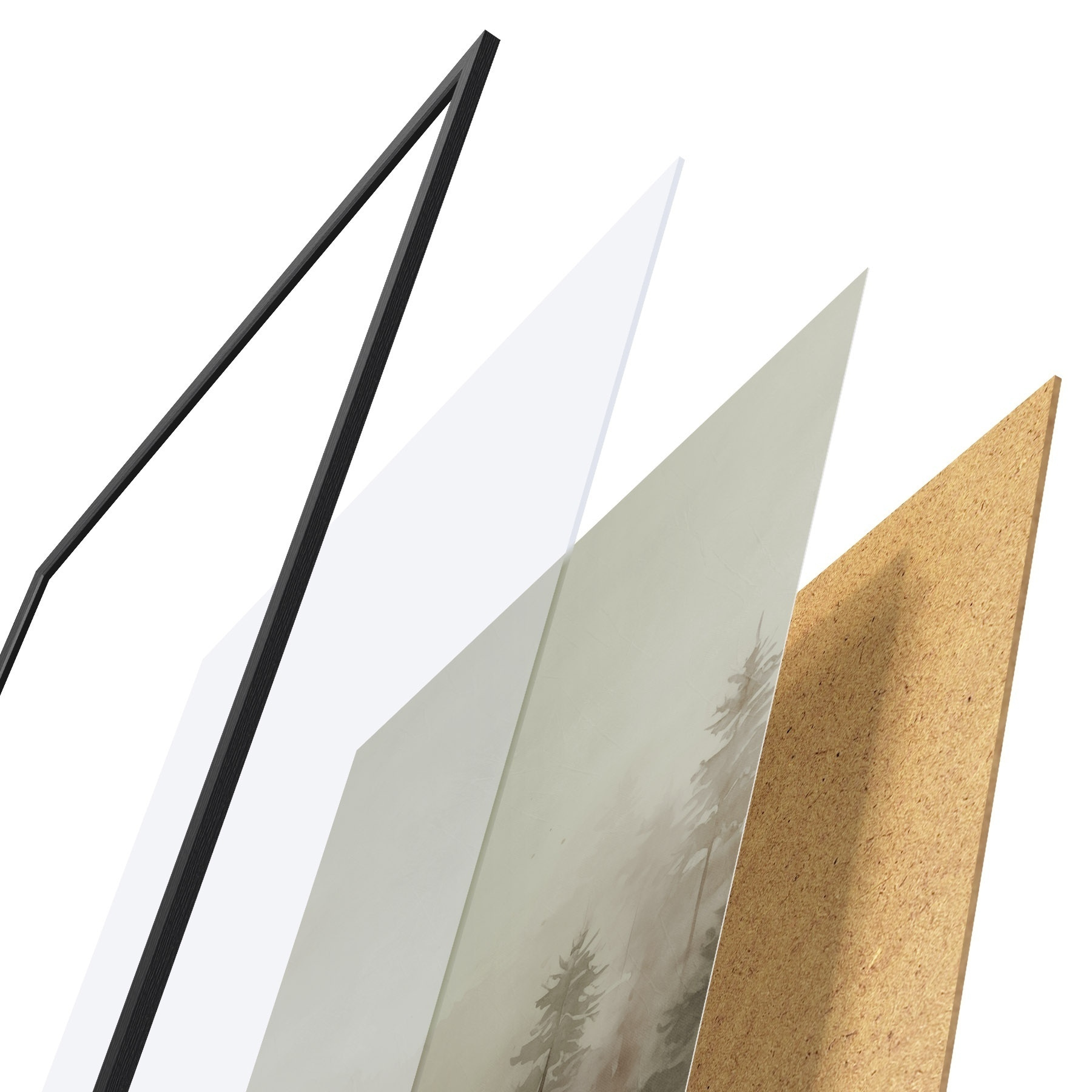 El póster consta de marco, plexiglás, imagen impresa y soporte de aglomerado. El póster puede colgarse inmediatamente en la pared gracias a los soportes de la parte posterior.