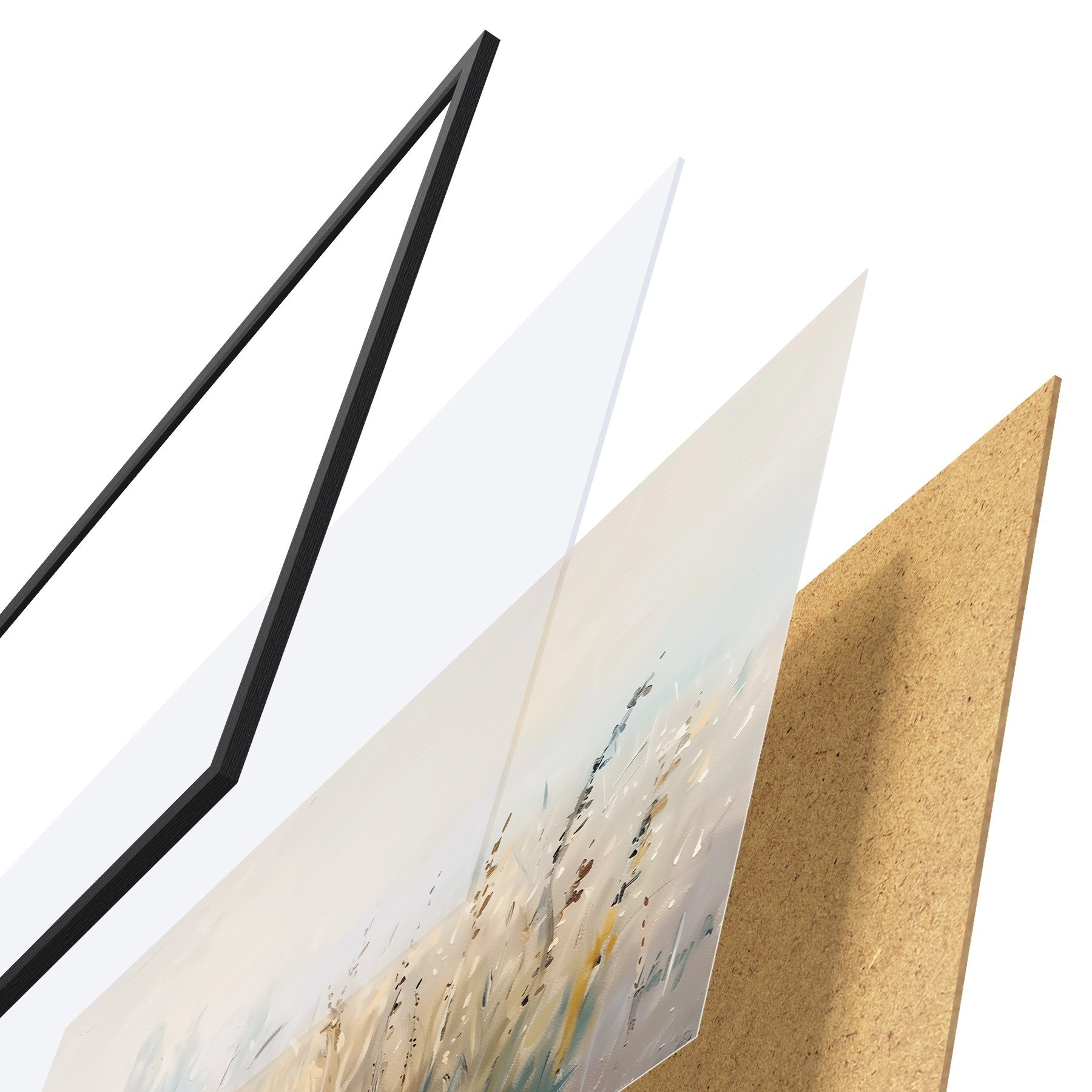 El póster consta de marco, plexiglás, imagen impresa y soporte de aglomerado. El póster puede colgarse inmediatamente en la pared gracias a los soportes de la parte posterior.