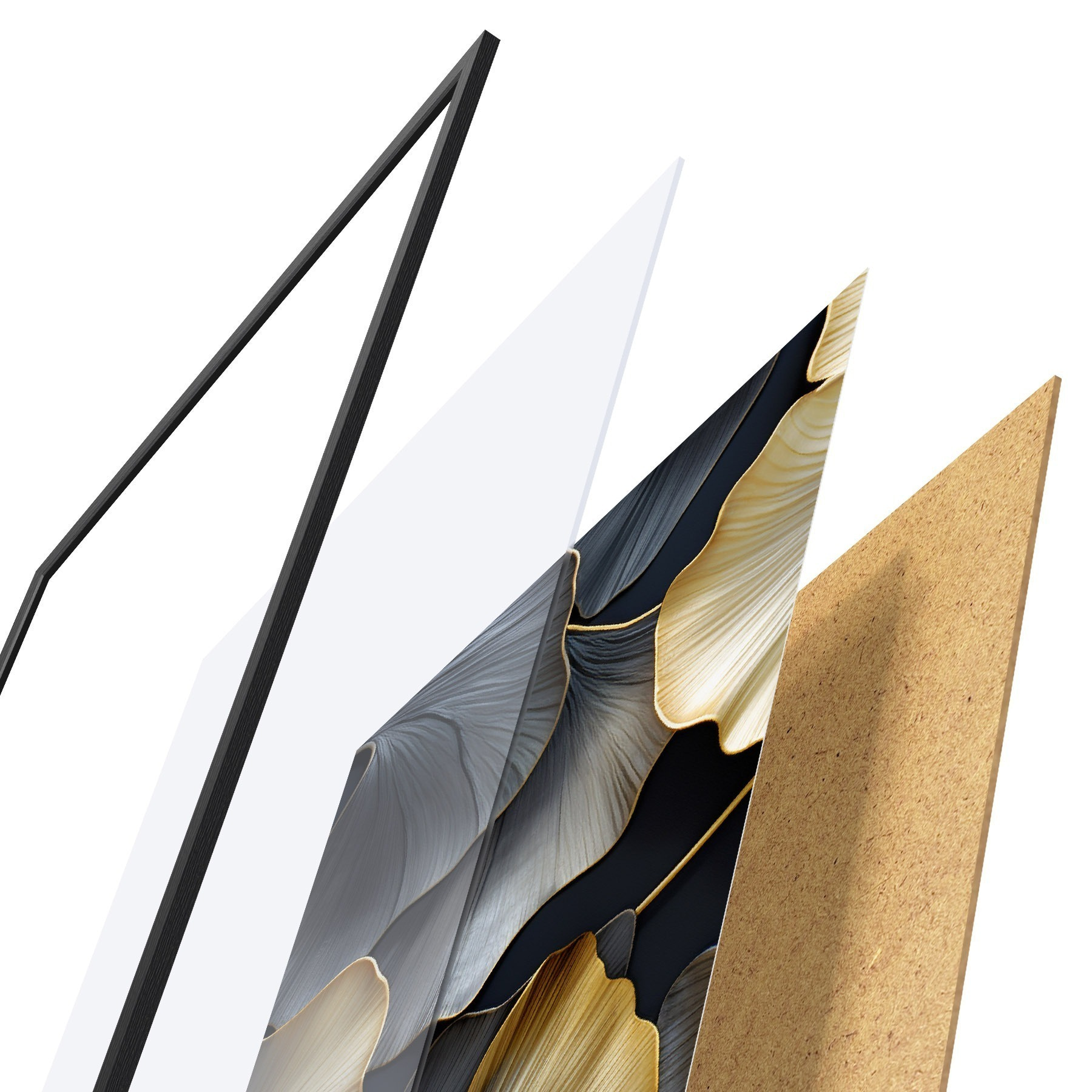 El póster consta de marco, plexiglás, imagen impresa y soporte de aglomerado. El póster puede colgarse inmediatamente en la pared gracias a los soportes de la parte posterior.