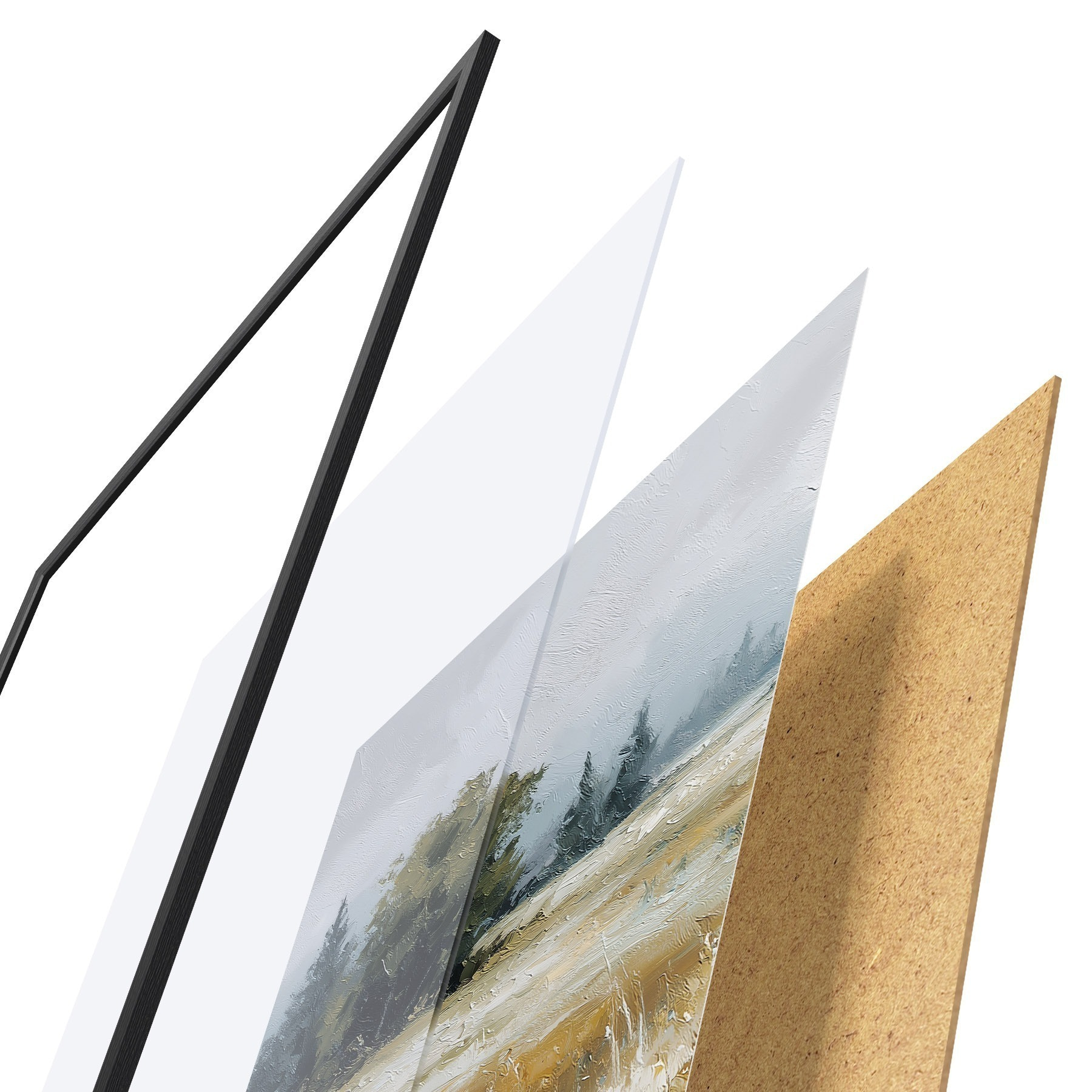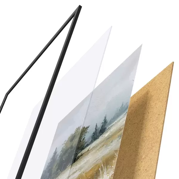 El póster consta de marco, plexiglás, imagen impresa y soporte de aglomerado. El póster puede colgarse inmediatamente en la pared gracias a los soportes de la parte posterior.
