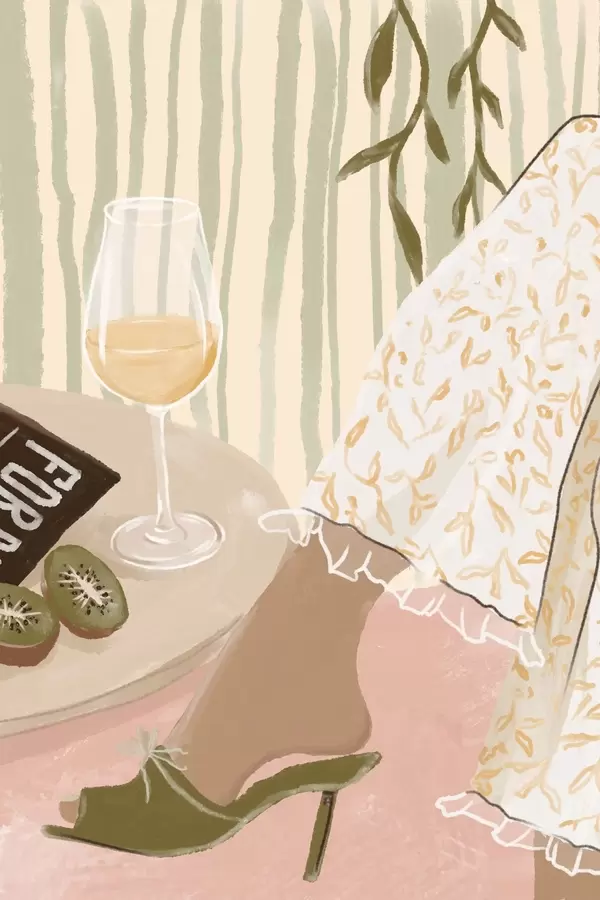 Poster Mesa con copa de vino y kiwi junto al vestido f48021