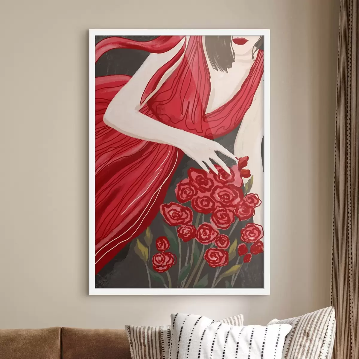 Poster Mujer con vestido rojo y ramo de rosas f48026