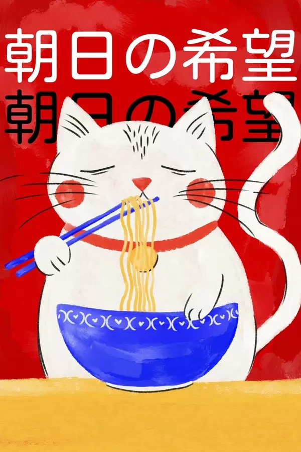Poster Ilustración de un gato comiendo fideos sobre un fondo rojo Nr f48031