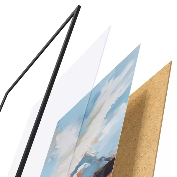 El póster consta de marco, plexiglás, imagen impresa y soporte de aglomerado. El póster puede colgarse inmediatamente en la pared gracias a los soportes de la parte posterior.
