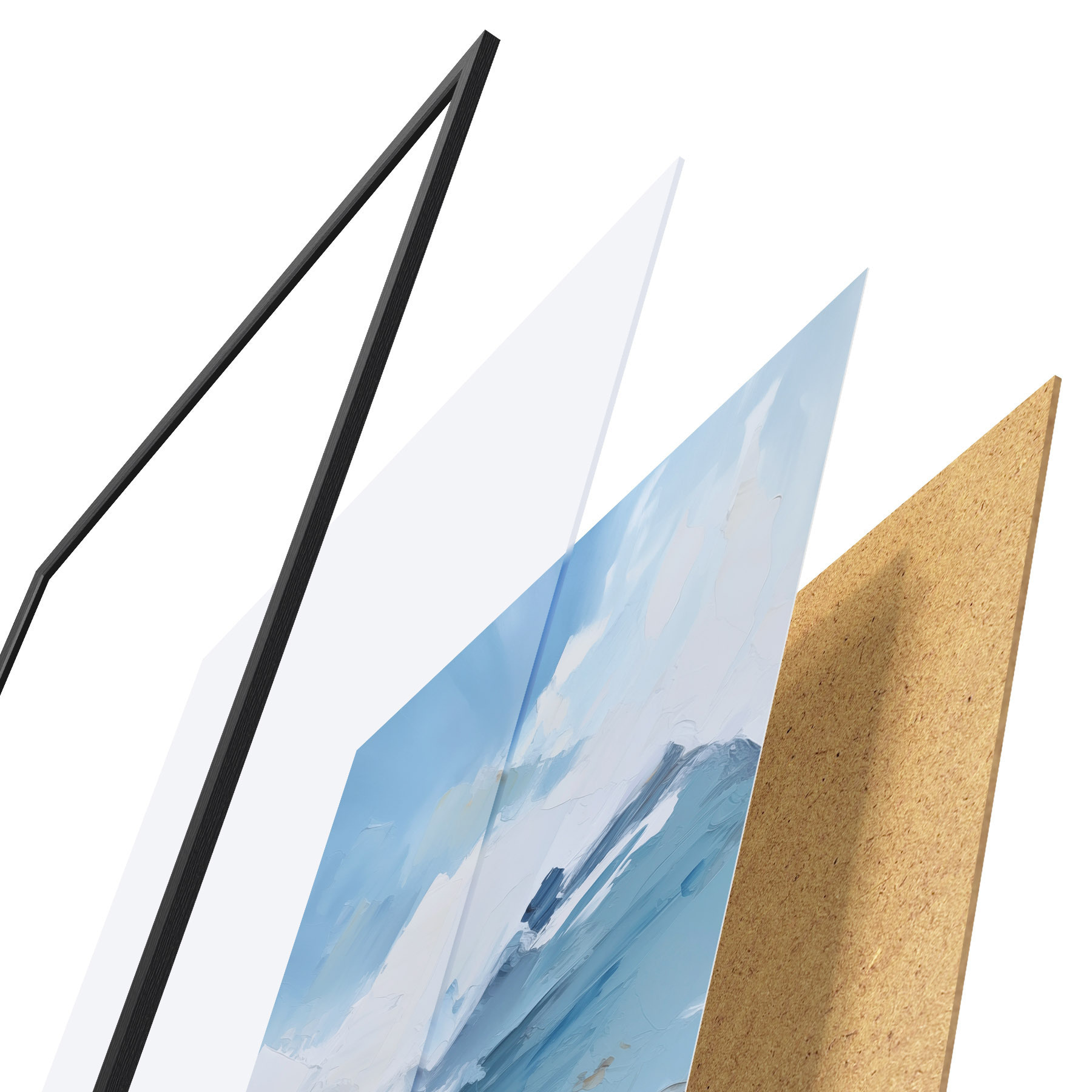 El póster consta de marco, plexiglás, imagen impresa y soporte de aglomerado. El póster puede colgarse inmediatamente en la pared gracias a los soportes de la parte posterior.