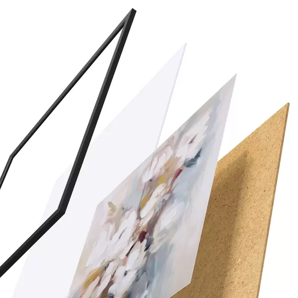 El póster consta de marco, plexiglás, imagen impresa y soporte de aglomerado. El póster puede colgarse inmediatamente en la pared gracias a los soportes de la parte posterior.