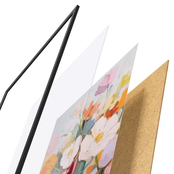 El póster consta de marco, plexiglás, imagen impresa y soporte de aglomerado. El póster puede colgarse inmediatamente en la pared gracias a los soportes de la parte posterior.