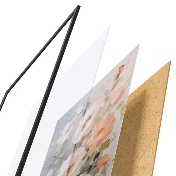 El póster consta de marco, plexiglás, imagen impresa y soporte de aglomerado. El póster puede colgarse inmediatamente en la pared gracias a los soportes de la parte posterior.