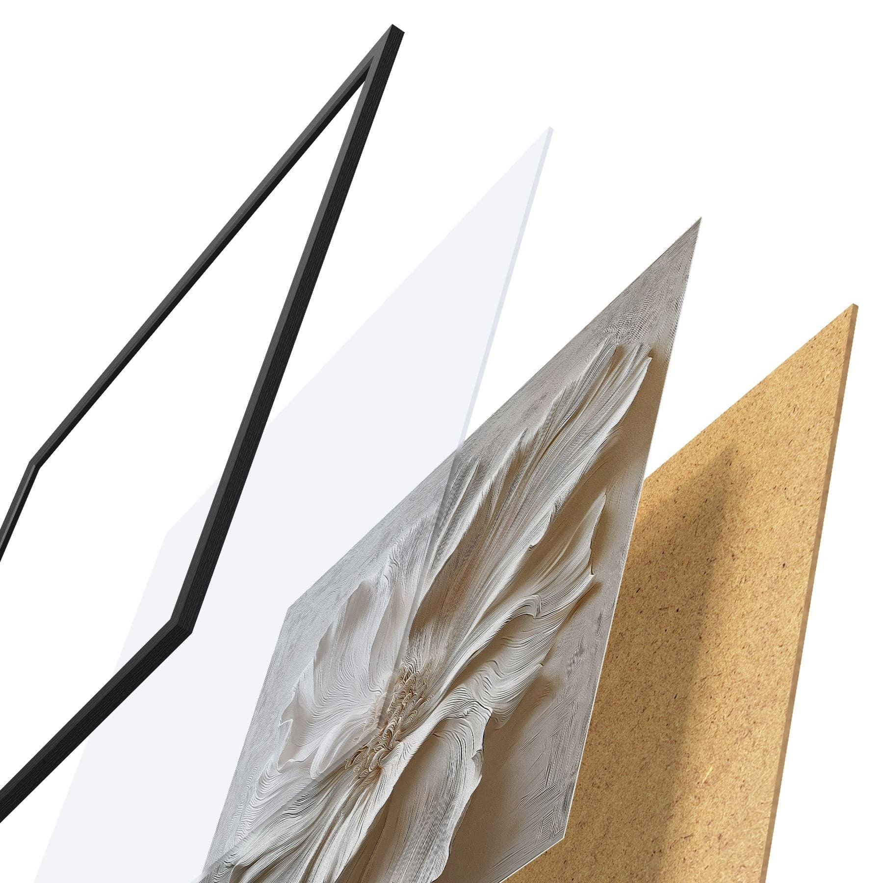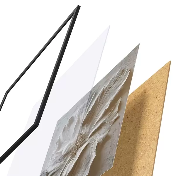 El póster consta de marco, plexiglás, imagen impresa y soporte de aglomerado. El póster puede colgarse inmediatamente en la pared gracias a los soportes de la parte posterior.