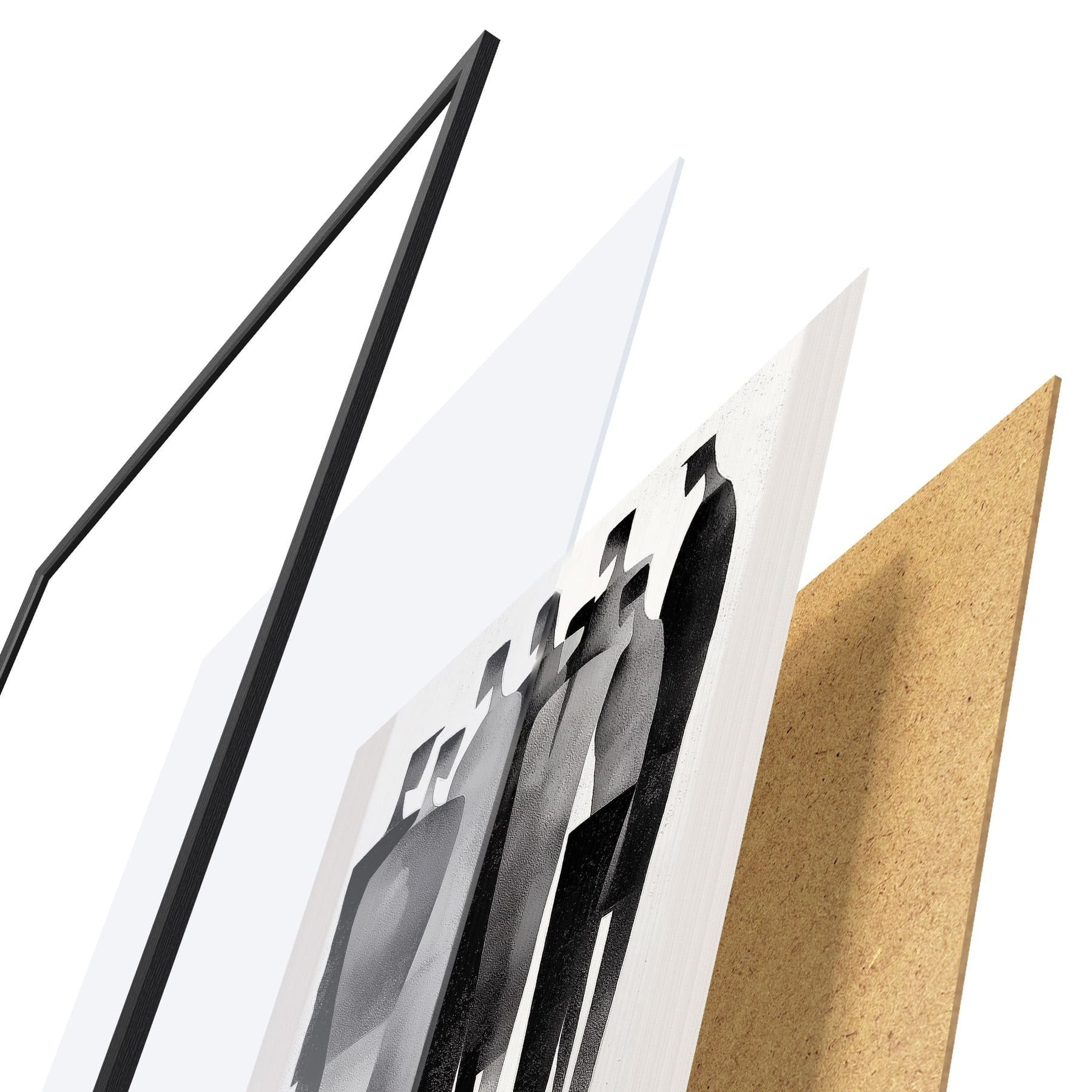 El póster consta de marco, plexiglás, imagen impresa y soporte de aglomerado. El póster puede colgarse inmediatamente en la pared gracias a los soportes de la parte posterior.