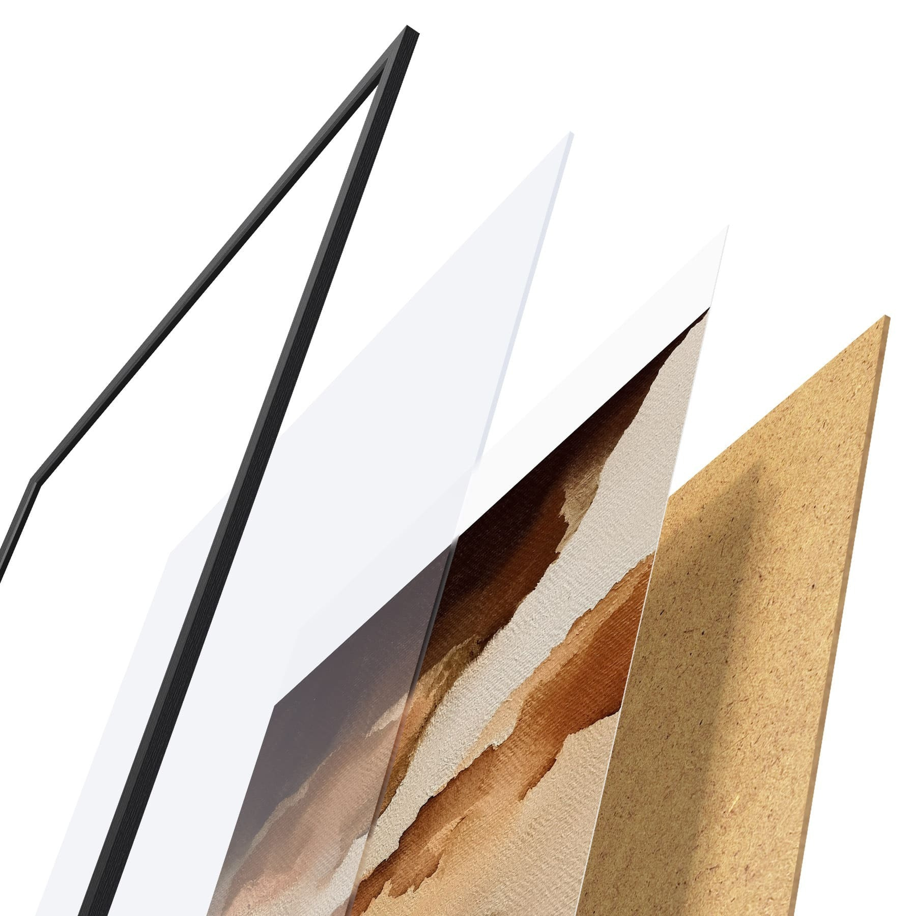 El póster consta de marco, plexiglás, imagen impresa y soporte de aglomerado. El póster puede colgarse inmediatamente en la pared gracias a los soportes de la parte posterior.