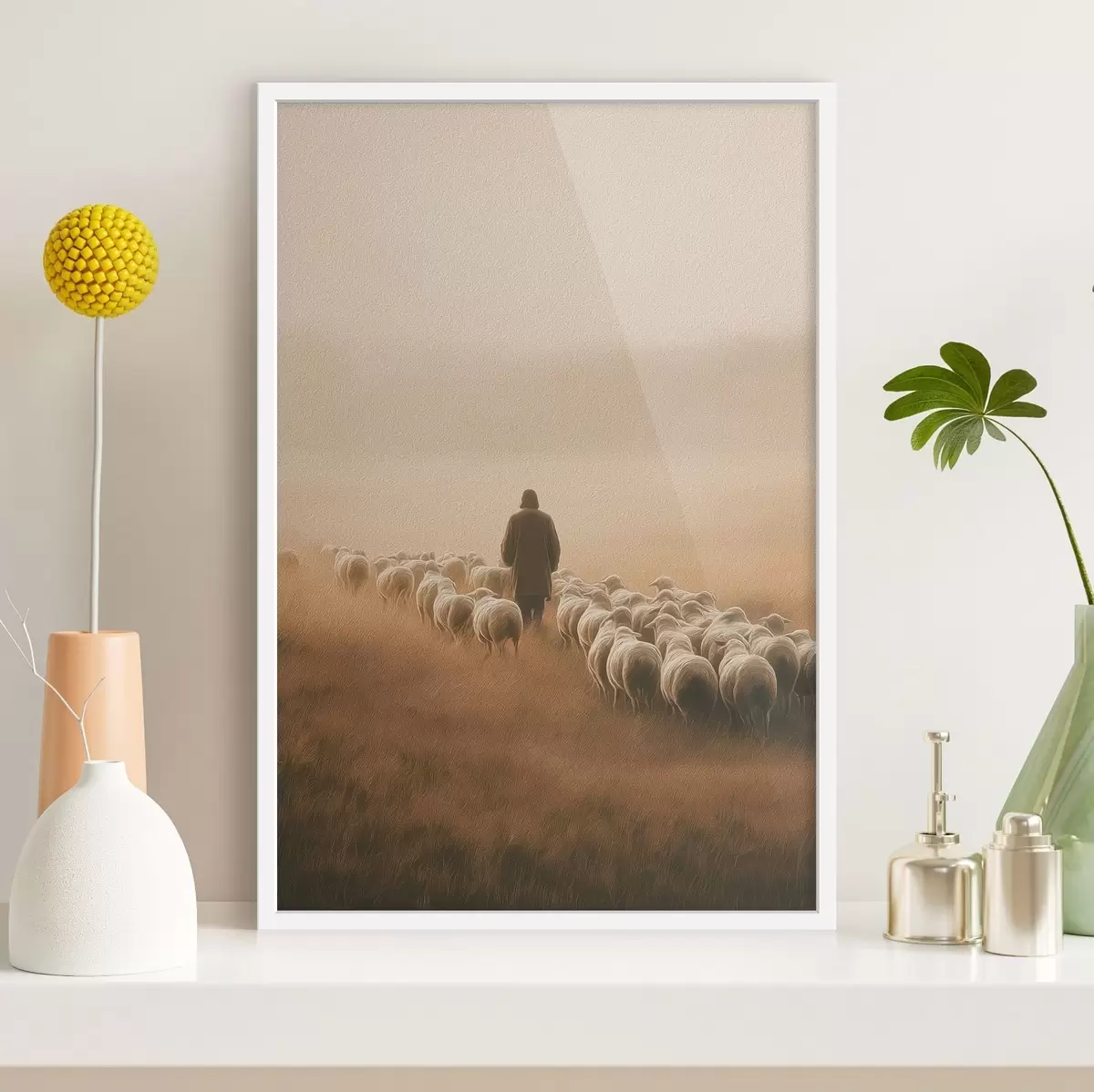 Poster Pastor caminando con un rebaño de ovejas en campo abierto. Nr f48077