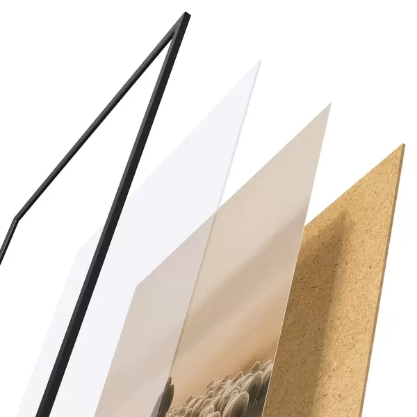 El póster consta de marco, plexiglás, imagen impresa y soporte de aglomerado. El póster puede colgarse inmediatamente en la pared gracias a los soportes de la parte posterior.