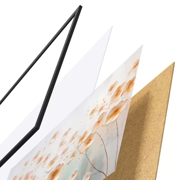 El póster consta de marco, plexiglás, imagen impresa y soporte de aglomerado. El póster puede colgarse inmediatamente en la pared gracias a los soportes de la parte posterior.