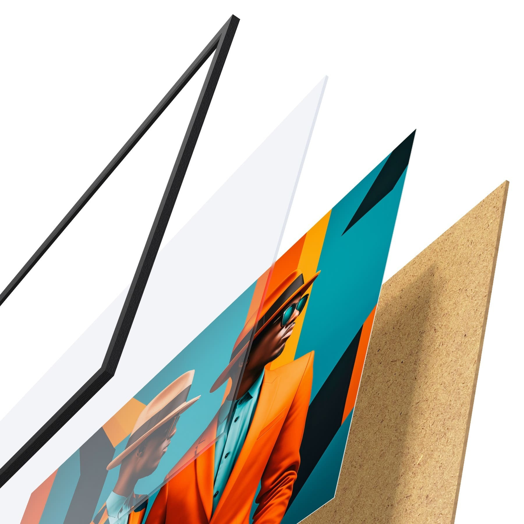 El póster consta de marco, plexiglás, imagen impresa y soporte de aglomerado. El póster puede colgarse inmediatamente en la pared gracias a los soportes de la parte posterior.
