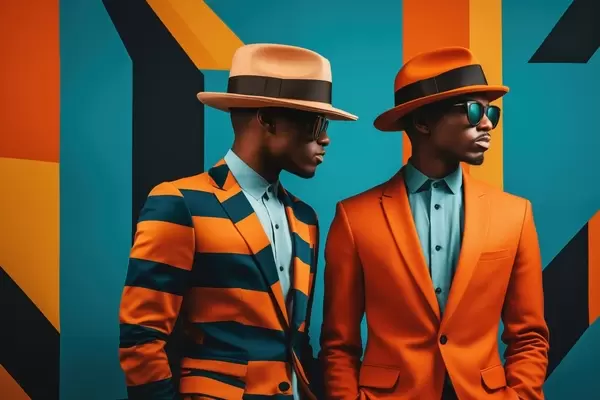 Poster Dos hombres con trajes brillantes y sombreros. f48091