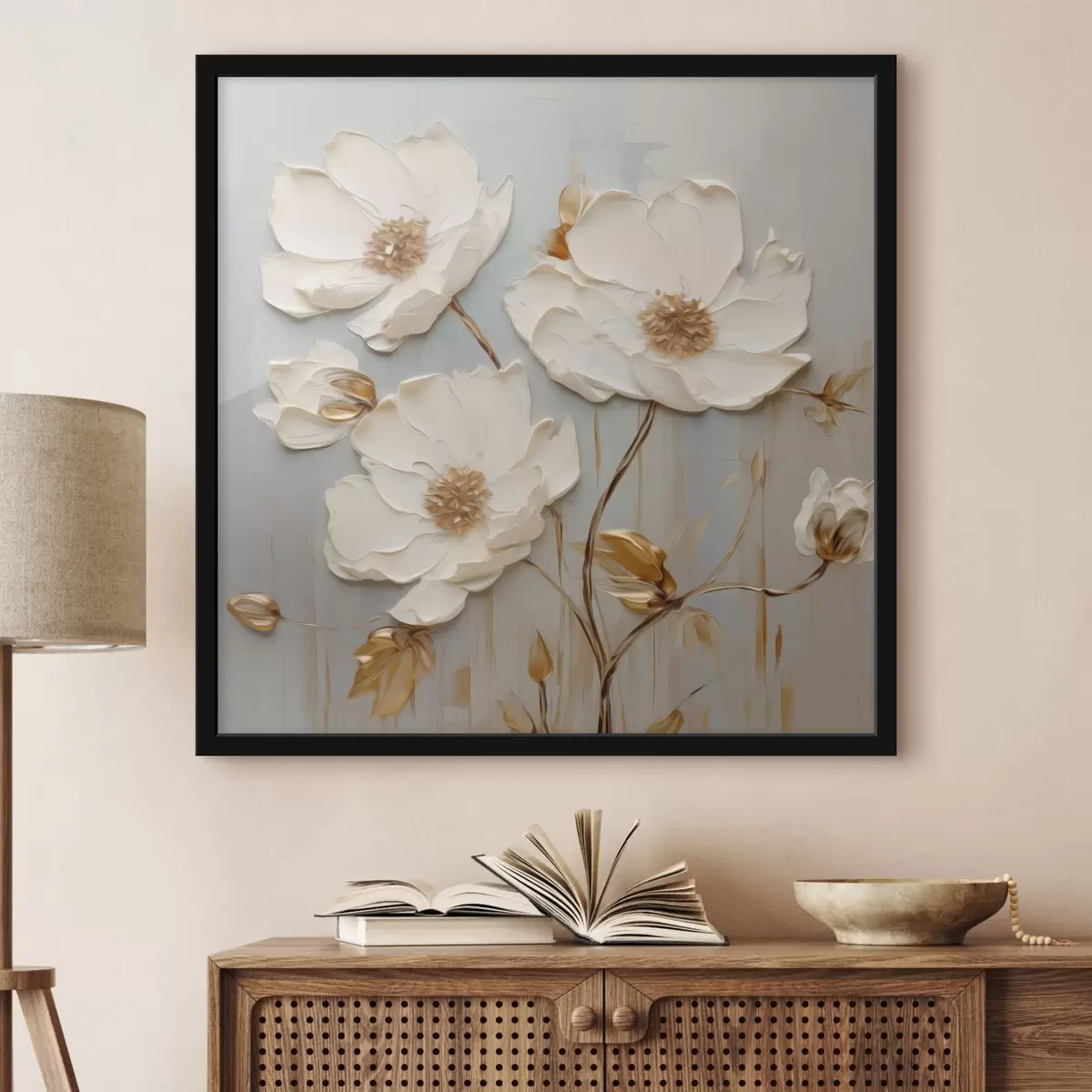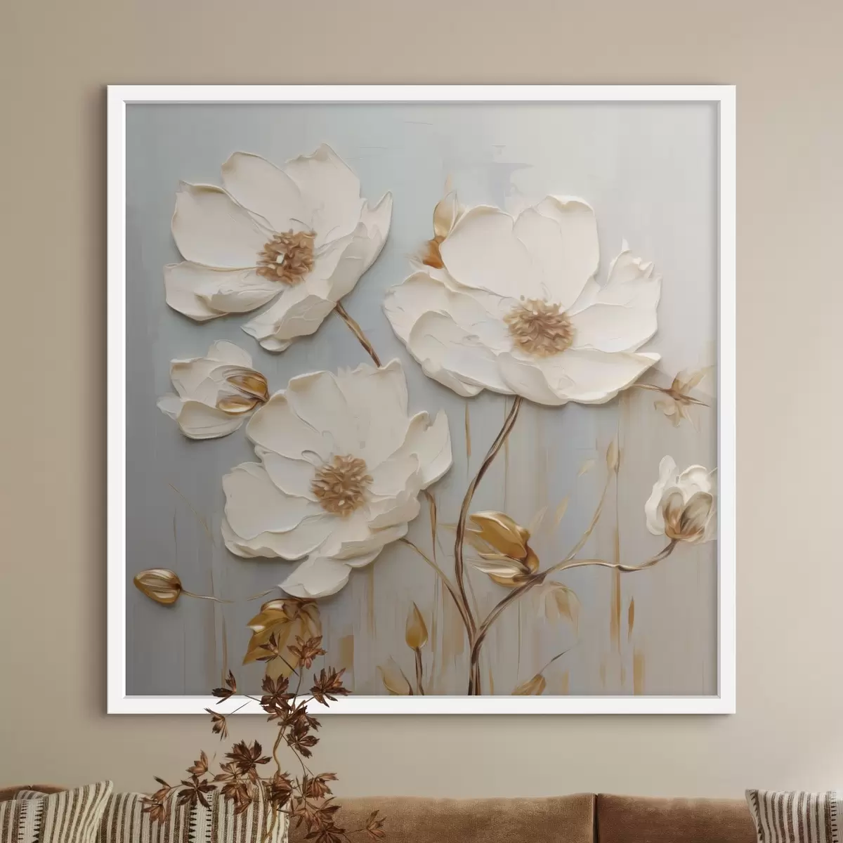 Poster Flores blancas en relieve con hojas cálidas f48093