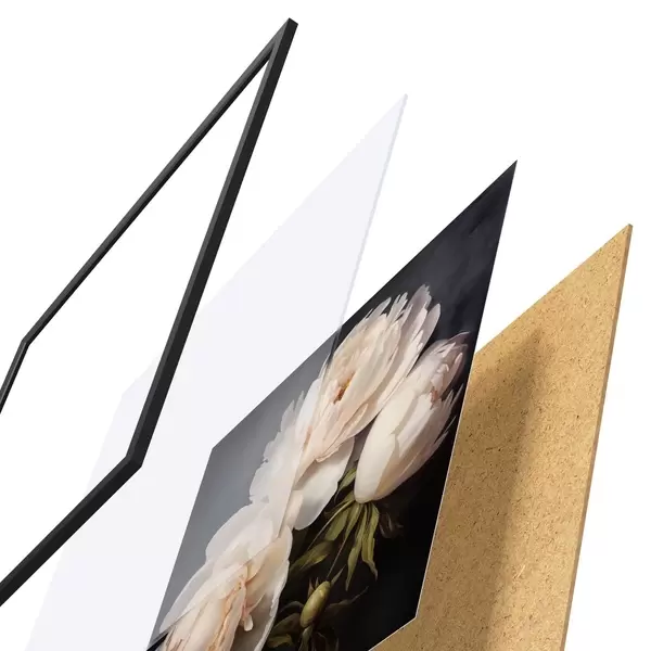 El póster consta de marco, plexiglás, imagen impresa y soporte de aglomerado. El póster puede colgarse inmediatamente en la pared gracias a los soportes de la parte posterior.