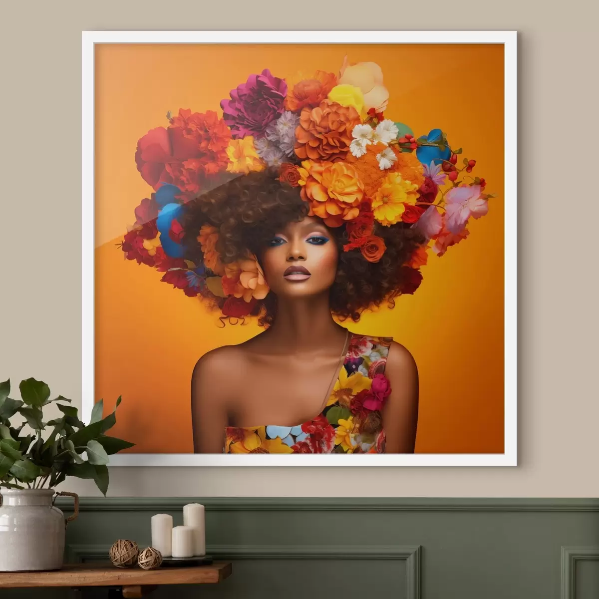 Poster Mujer con tocado floral sobre fondo naranja f48102