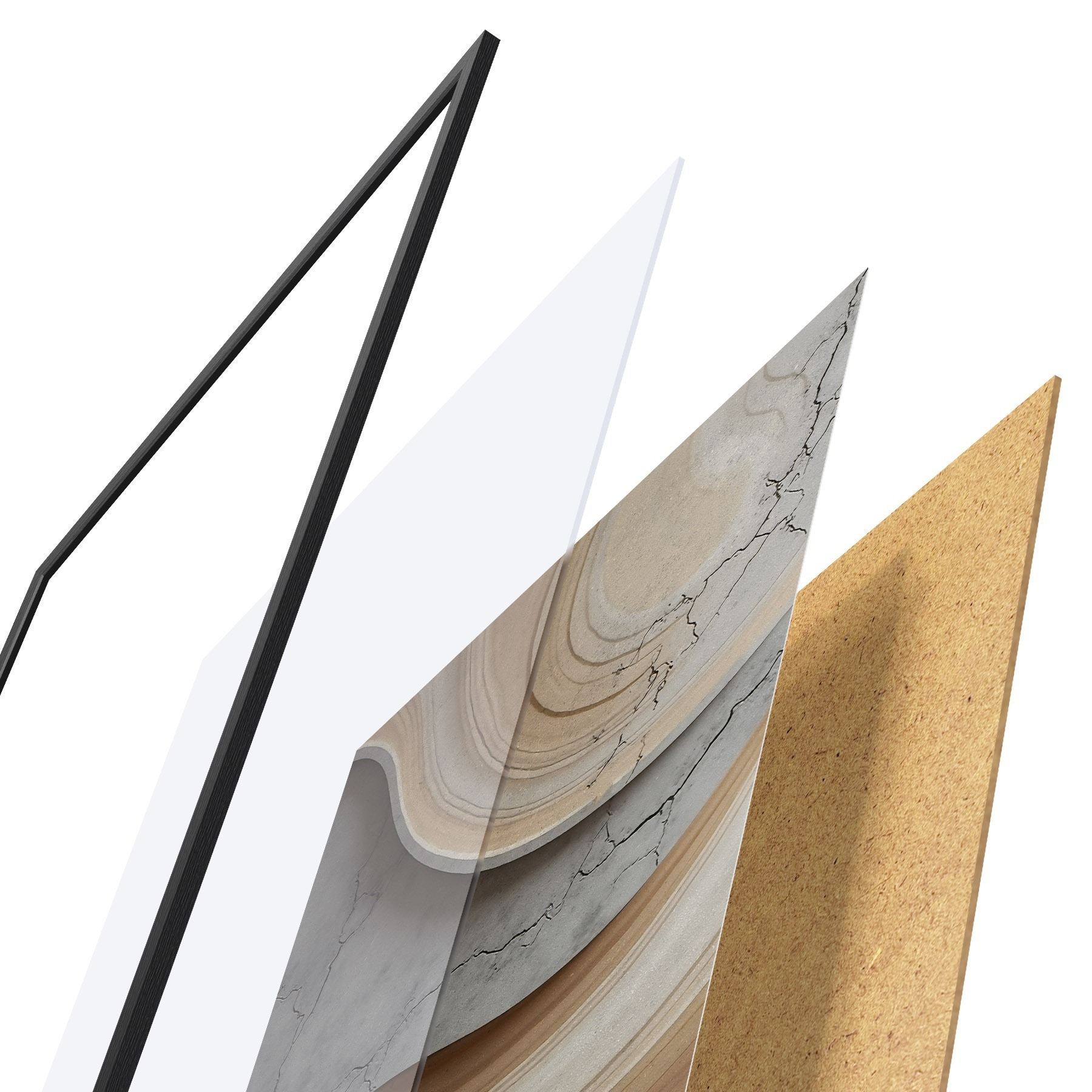 El póster consta de marco, plexiglás, imagen impresa y soporte de aglomerado. El póster puede colgarse inmediatamente en la pared gracias a los soportes de la parte posterior.