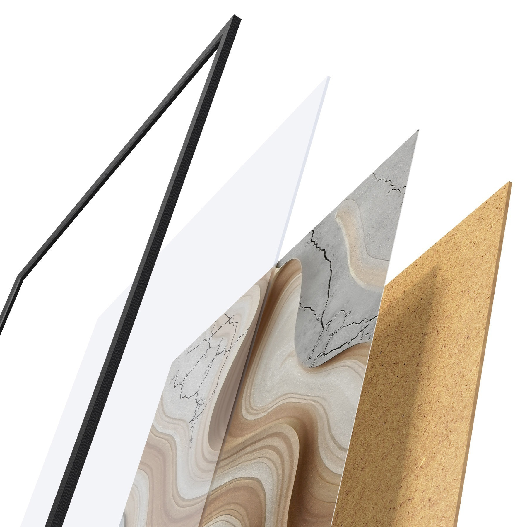 El póster consta de marco, plexiglás, imagen impresa y soporte de aglomerado. El póster puede colgarse inmediatamente en la pared gracias a los soportes de la parte posterior.
