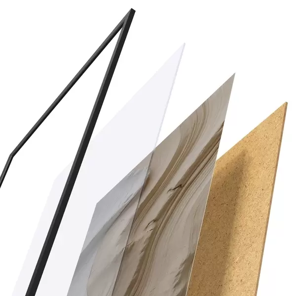 El póster consta de marco, plexiglás, imagen impresa y soporte de aglomerado. El póster puede colgarse inmediatamente en la pared gracias a los soportes de la parte posterior.