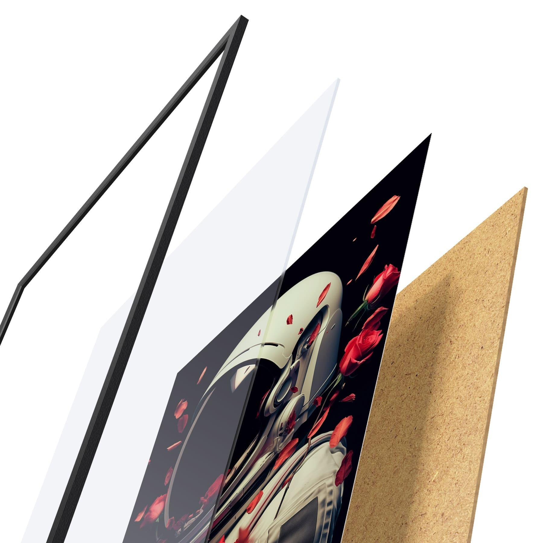El póster consta de marco, plexiglás, imagen impresa y soporte de aglomerado. El póster puede colgarse inmediatamente en la pared gracias a los soportes de la parte posterior.