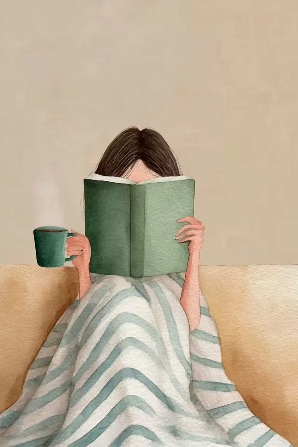 Poster Ilustración en acuarela suave de una mujer sentada en un sofá leyendo un libro. f48114