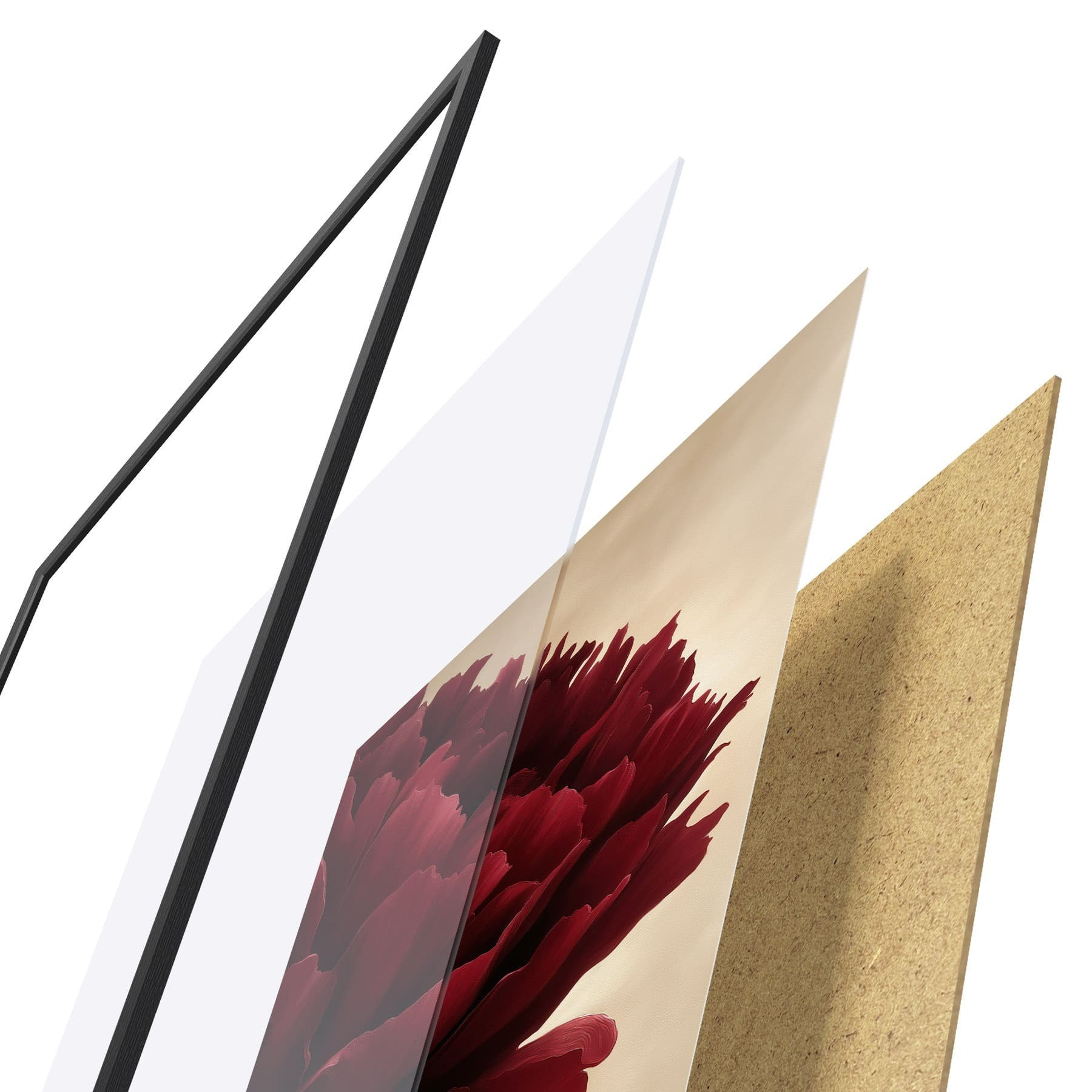 El póster consta de marco, plexiglás, imagen impresa y soporte de aglomerado. El póster puede colgarse inmediatamente en la pared gracias a los soportes de la parte posterior.