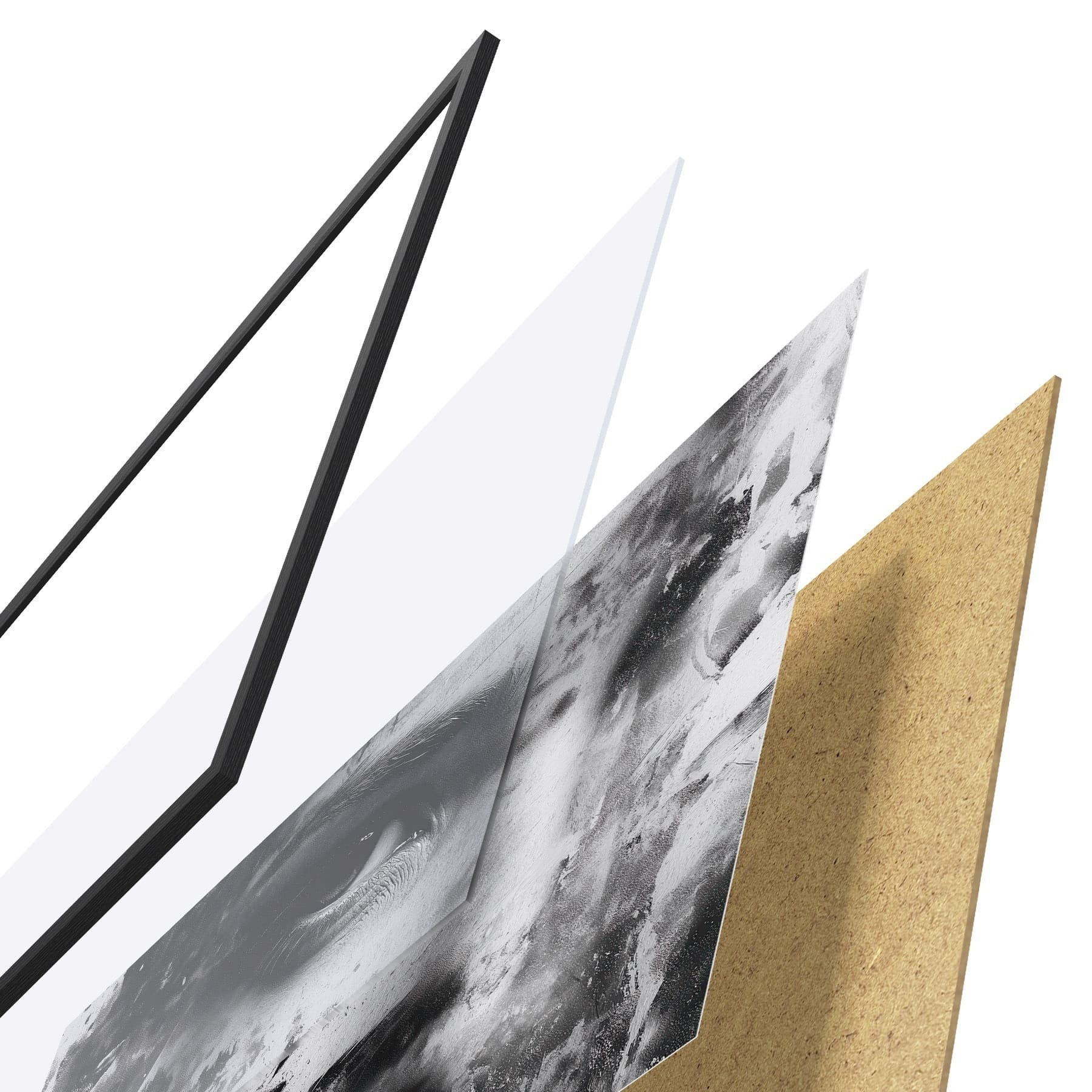 El póster consta de marco, plexiglás, imagen impresa y soporte de aglomerado. El póster puede colgarse inmediatamente en la pared gracias a los soportes de la parte posterior.