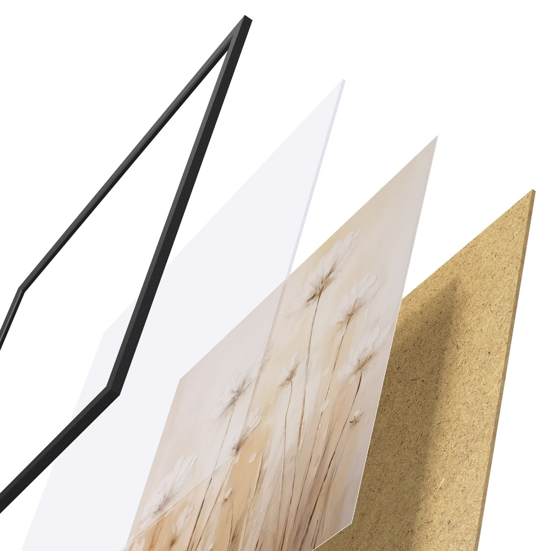El póster consta de marco, plexiglás, imagen impresa y soporte de aglomerado. El póster puede colgarse inmediatamente en la pared gracias a los soportes de la parte posterior.