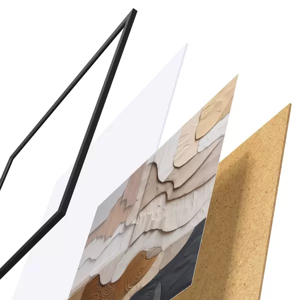 El póster consta de marco, plexiglás, imagen impresa y soporte de aglomerado. El póster puede colgarse inmediatamente en la pared gracias a los soportes de la parte posterior.