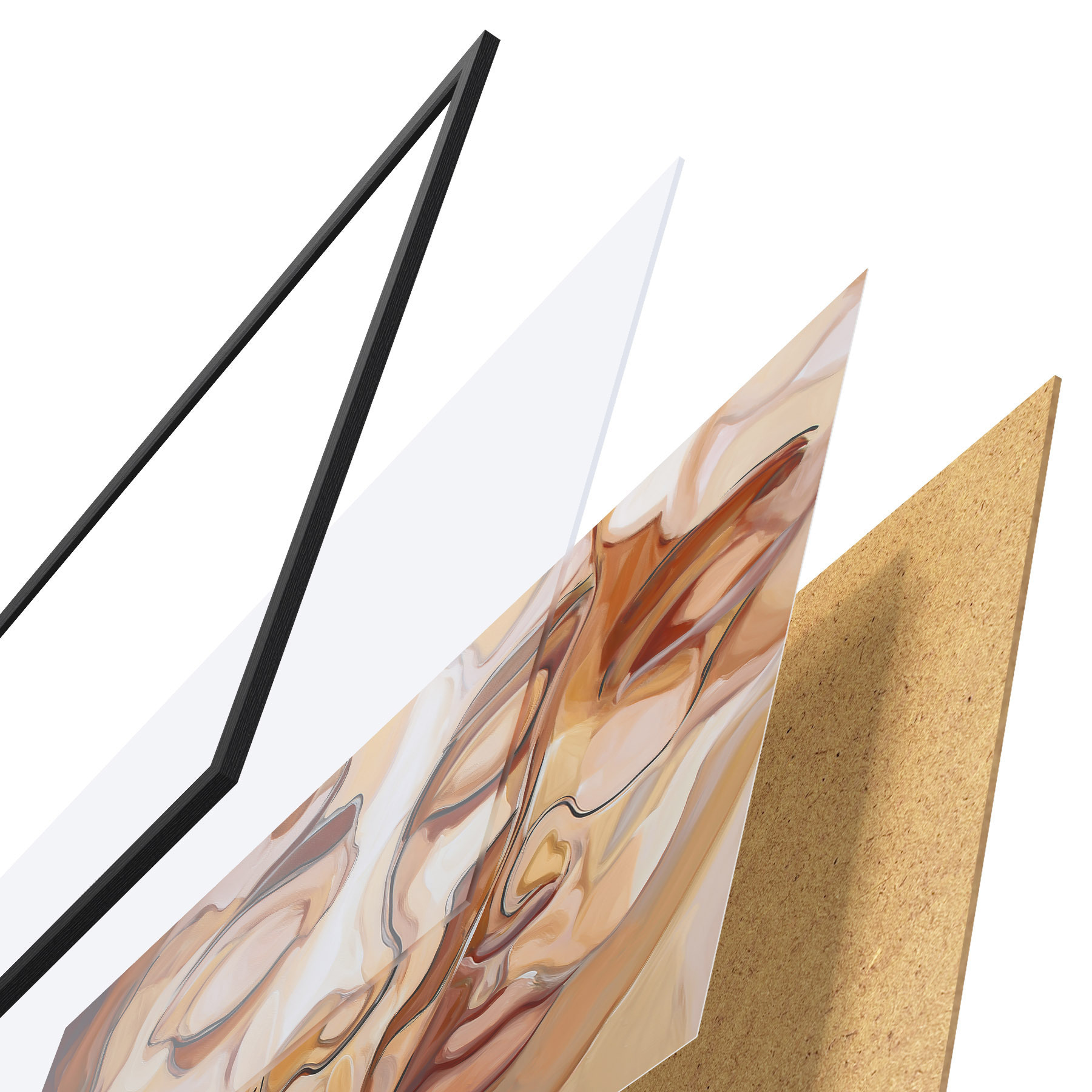 El póster consta de marco, plexiglás, imagen impresa y soporte de aglomerado. El póster puede colgarse inmediatamente en la pared gracias a los soportes de la parte posterior.