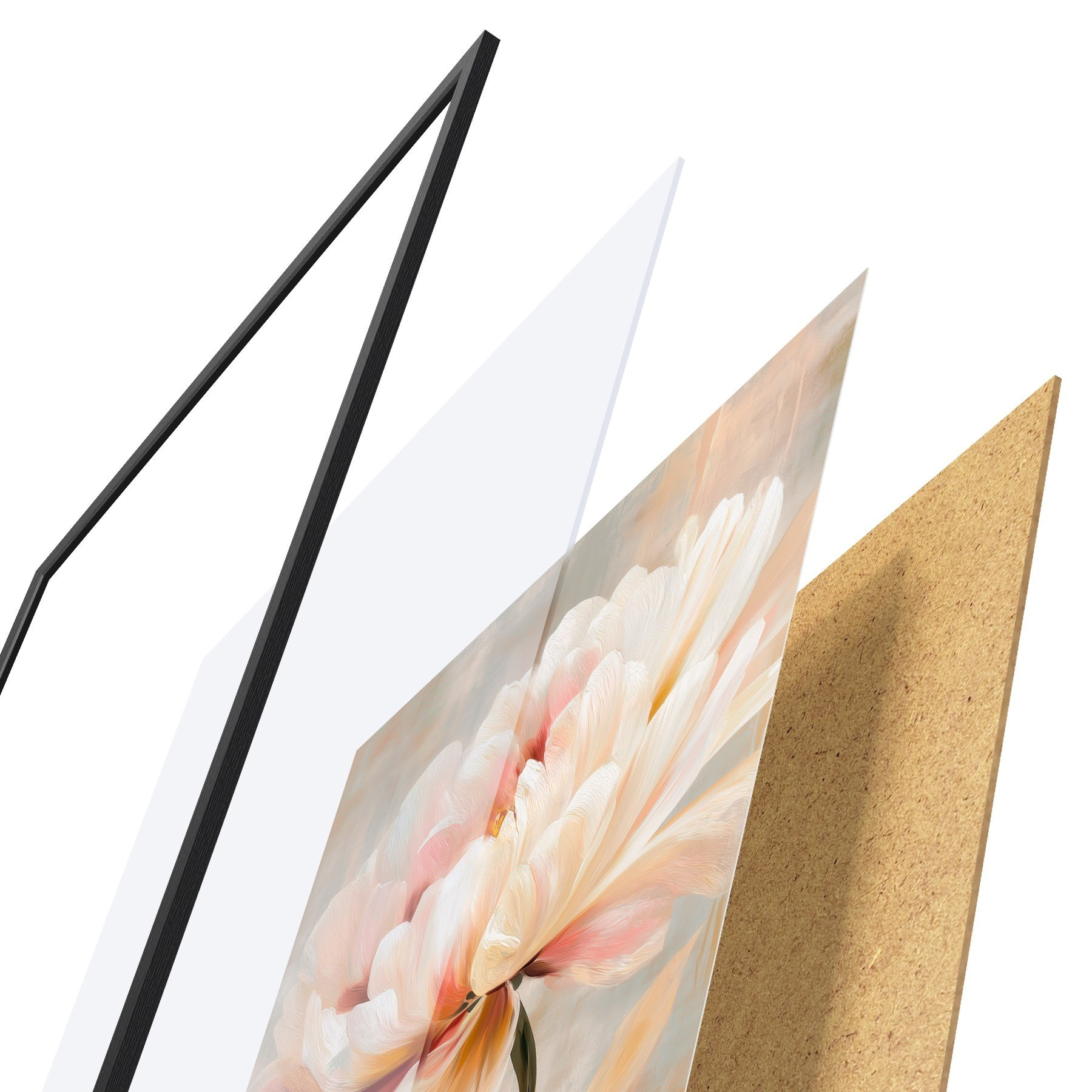 El póster consta de marco, plexiglás, imagen impresa y soporte de aglomerado. El póster puede colgarse inmediatamente en la pared gracias a los soportes de la parte posterior.