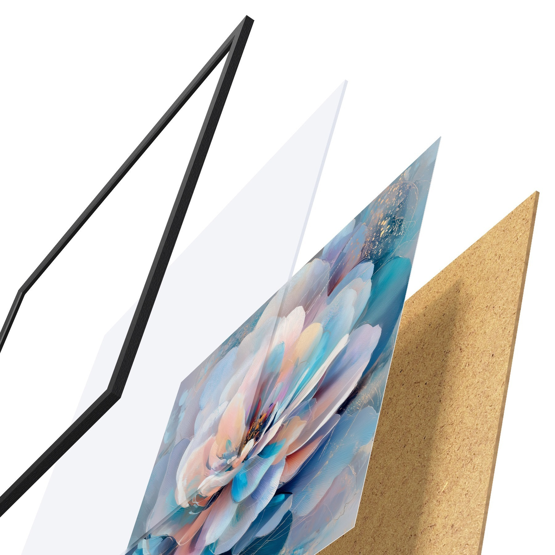 El póster consta de marco, plexiglás, imagen impresa y soporte de aglomerado. El póster puede colgarse inmediatamente en la pared gracias a los soportes de la parte posterior.