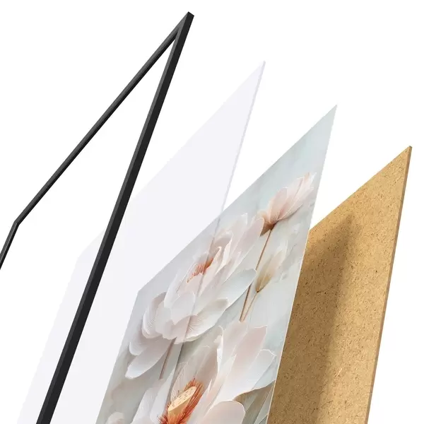 El póster consta de marco, plexiglás, imagen impresa y soporte de aglomerado. El póster puede colgarse inmediatamente en la pared gracias a los soportes de la parte posterior.
