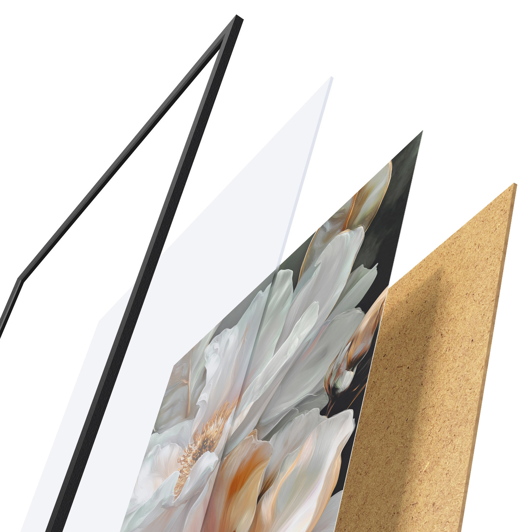 El póster consta de marco, plexiglás, imagen impresa y soporte de aglomerado. El póster puede colgarse inmediatamente en la pared gracias a los soportes de la parte posterior.