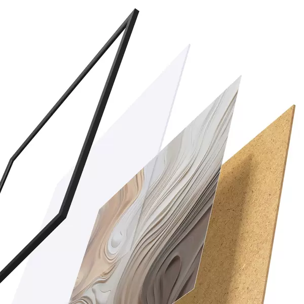 El póster consta de marco, plexiglás, imagen impresa y soporte de aglomerado. El póster puede colgarse inmediatamente en la pared gracias a los soportes de la parte posterior.