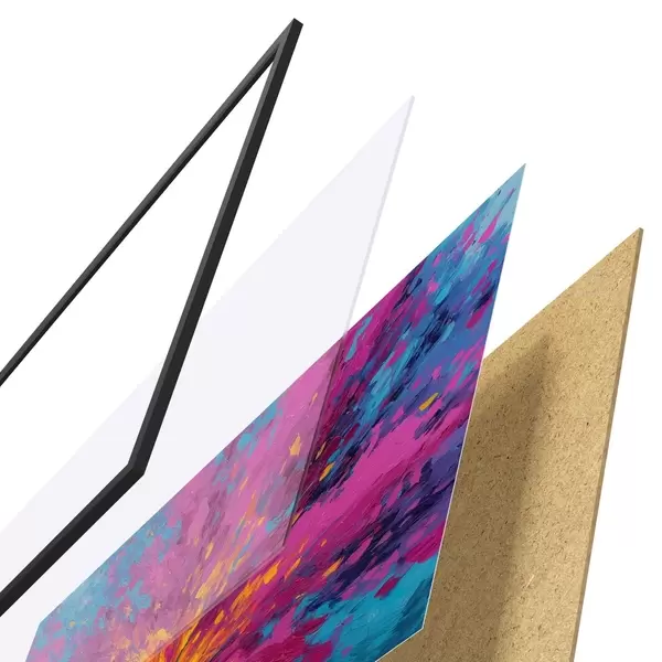 El póster consta de marco, plexiglás, imagen impresa y soporte de aglomerado. El póster puede colgarse inmediatamente en la pared gracias a los soportes de la parte posterior.