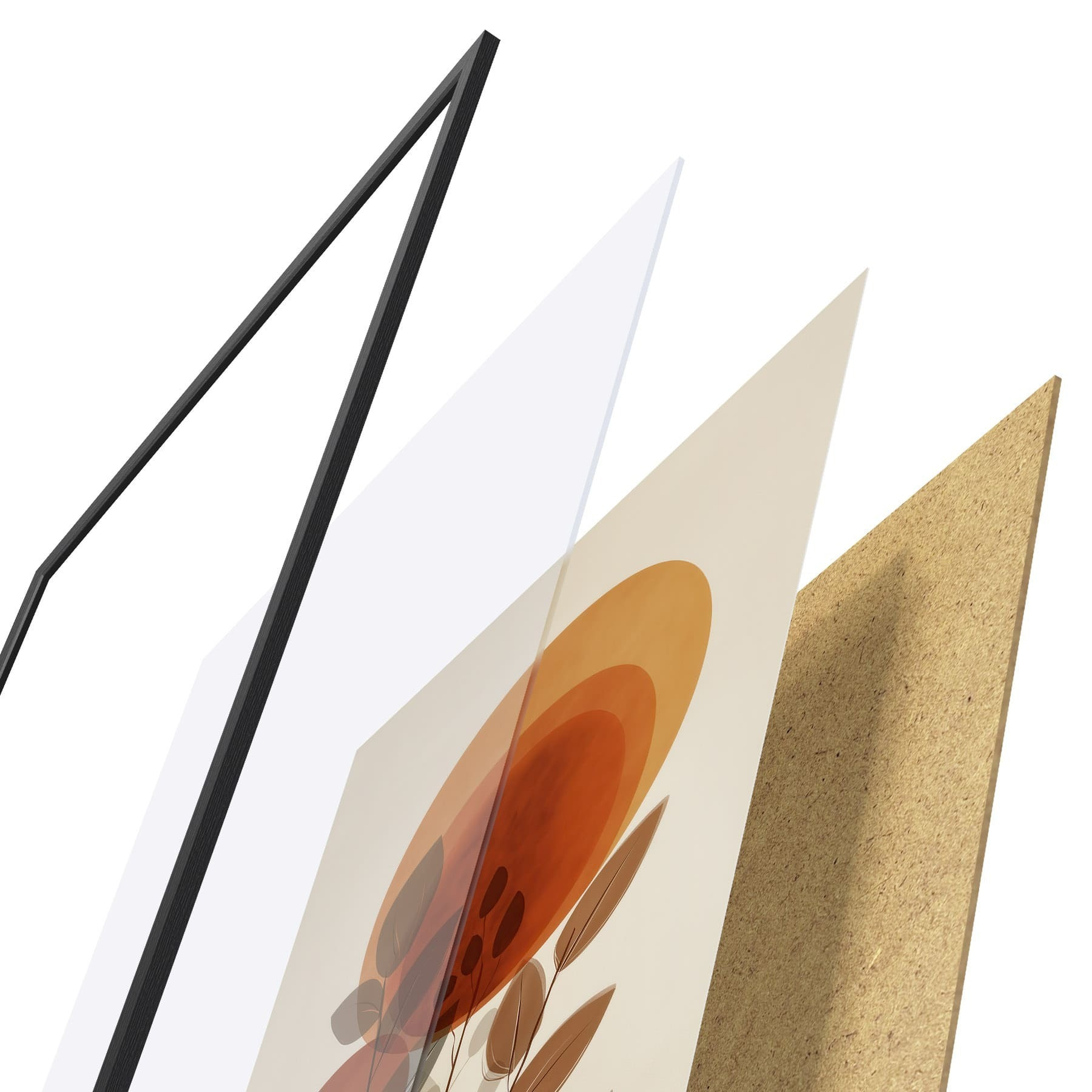 El póster consta de marco, plexiglás, imagen impresa y soporte de aglomerado. El póster puede colgarse inmediatamente en la pared gracias a los soportes de la parte posterior.
