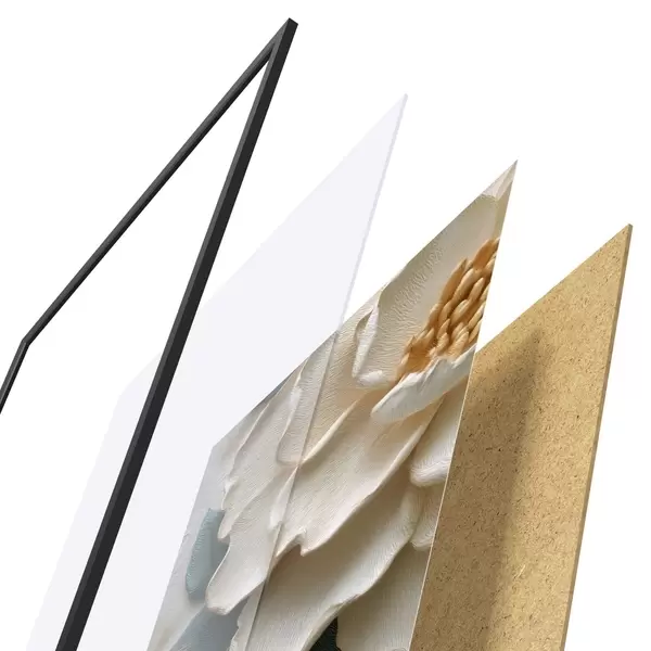 El póster consta de marco, plexiglás, imagen impresa y soporte de aglomerado. El póster puede colgarse inmediatamente en la pared gracias a los soportes de la parte posterior.
