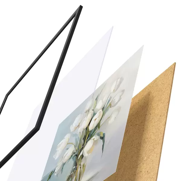El póster consta de marco, plexiglás, imagen impresa y soporte de aglomerado. El póster puede colgarse inmediatamente en la pared gracias a los soportes de la parte posterior.
