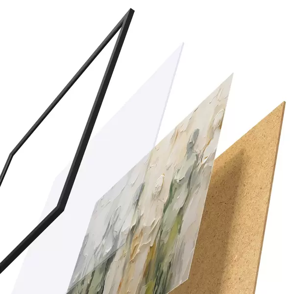 El póster consta de marco, plexiglás, imagen impresa y soporte de aglomerado. El póster puede colgarse inmediatamente en la pared gracias a los soportes de la parte posterior.