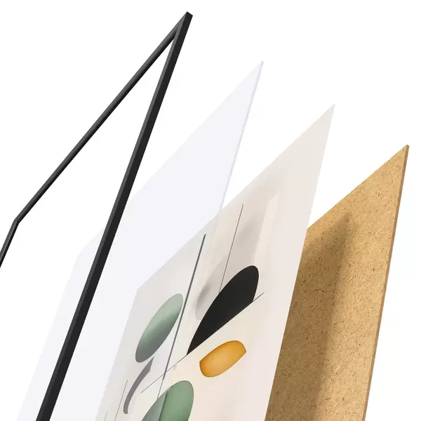 El póster consta de marco, plexiglás, imagen impresa y soporte de aglomerado. El póster puede colgarse inmediatamente en la pared gracias a los soportes de la parte posterior.
